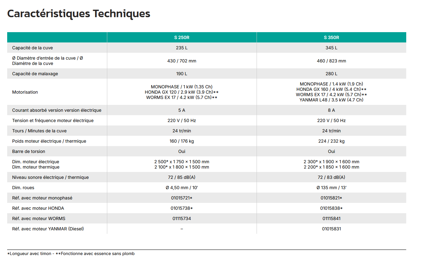- S 250R : 1,5 sac de 35 kg (selon dosage du béton)