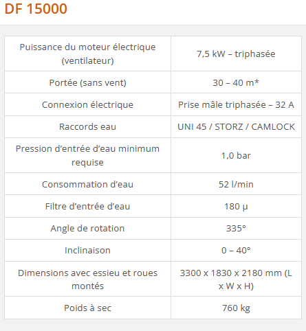 Le Dust Fighter DF 15000 est un système de contrôle des poussières par brumisation, conçu pour les chantiers de taille petite à moyenne. Il projette un fin brouillard d'eau jusqu'à 50 mètres, capturant efficacement les particules en suspension.