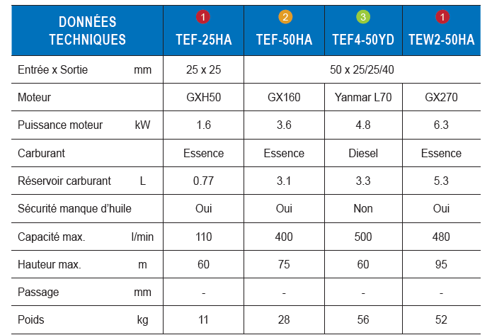 - Type : Pompes centrifuges auto-amorçantes à grande hauteur de refoulement.