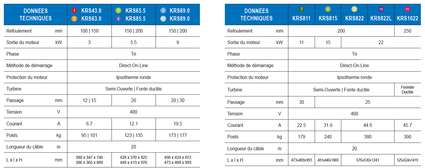 La série KRS regroupe des pompes d’épuisement submersibles triphasées en fonte, équipées d’un moteur à 4 pôles.